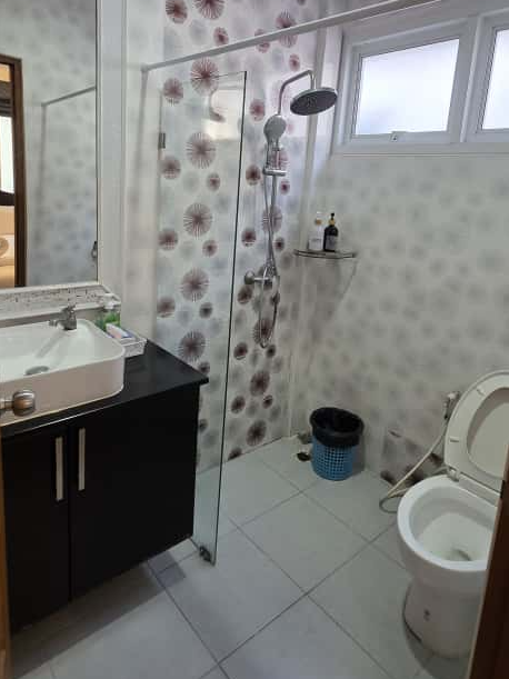 Bedroom 5This bright and cozy bedroom features a comfortable bed, soft lighting, and large windows with curtains that open up to refreshing outdoor views. The room includes side tables, air conditioning, and essential amenities like towels, a dryer, and a dentist kit for added convenience. The attached bathroom is spacious and modern, with a sleek vanity, premium fittings, and a glass-partition shower.